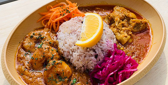ピリッとスパイスのきいたチキンカレーとマイルドでコクのあるエビカレーの2種を味わえるカレー。